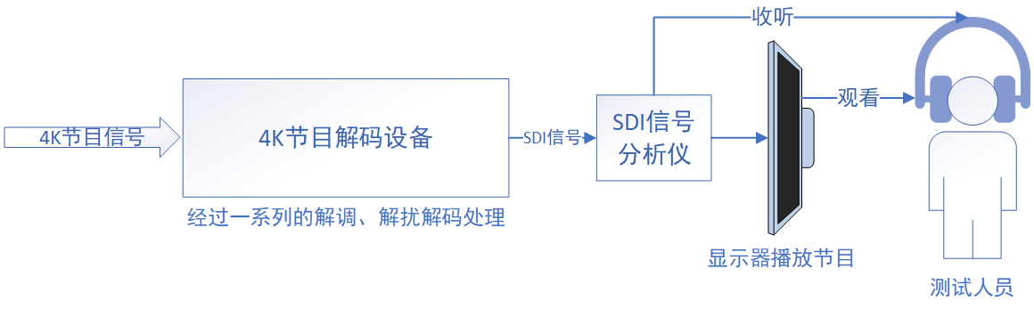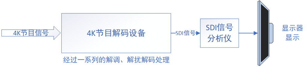 4、通過4K信號解碼設(shè)備在對4K數(shù)字電視信號解調(diào)解擾和解碼處理后,使其以SDI信號格式進(jìn)行輸出,輸出SDI信號至SDI信號分析儀。SDI信號分析儀通過配置揚聲器和顯示器來展示播放音視頻內(nèi)容。