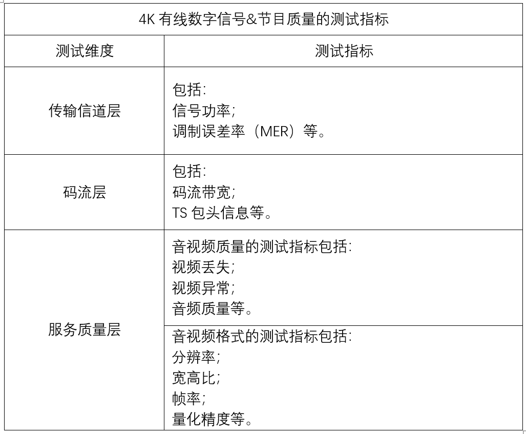 4K有線數(shù)字電視系統(tǒng)對音視頻的處理主要包含了信源編碼、碼流復(fù)用、信道傳輸?shù)汝P(guān)鍵過程。所以針對4K有線數(shù)字電視節(jié)目質(zhì)量的測量我們可以采取分層測試的方法,大致可分為三個層級,分別為傳輸信道層、碼流層和服務(wù)質(zhì)量層,針對每個層級我們列出了不同的測試指標(biāo),這些指標(biāo)都對應(yīng)著各自的門限要求,同時也作為評判標(biāo)準(zhǔn),這些測試指標(biāo)綜合起來能夠較為全面的反應(yīng)當(dāng)前4K電視節(jié)目信號的好壞。具體如下表所示。?