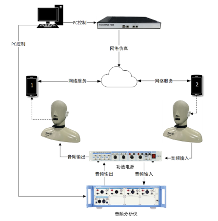 2)確認(rèn)被測物之間保持正常的音頻連接,音頻分析儀連接至功放電源再連接至兩個人工頭,人工頭用于輸出/采集音頻,將網(wǎng)絡(luò)損傷仿真儀接入被測物所處的網(wǎng)絡(luò)環(huán)境中,音頻分析儀以及網(wǎng)絡(luò) 損傷仿真儀均使用PC進(jìn)行控制,測試前需使用音頻分析儀中的“DUT Delay”功能測試傳輸鏈路中的延時;