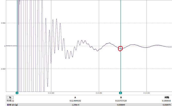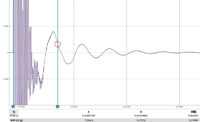 i 圖片分析:從兩張圖片中可以看出,我們在相同條件下進行了對比,選取的時間間隔均為約100ms,波形幅度值均為±1g,以保證完全相同的測試環(huán)境。紅圈標記的位置代表了高頻振動分量消失的時刻。盡管兩個減振棒在該位置均達到了高頻振動的消失狀態(tài),但阻尼特性差的減振棒所需的衰減時間顯著長于阻尼特性好的減振棒,這表明其對高頻振動的抑制能力較弱,而阻尼特性好的減振棒在更短時間內(nèi)能夠消除高頻成分并恢復平穩(wěn)狀態(tài),從而表現(xiàn)出更優(yōu)異的減震效果。
