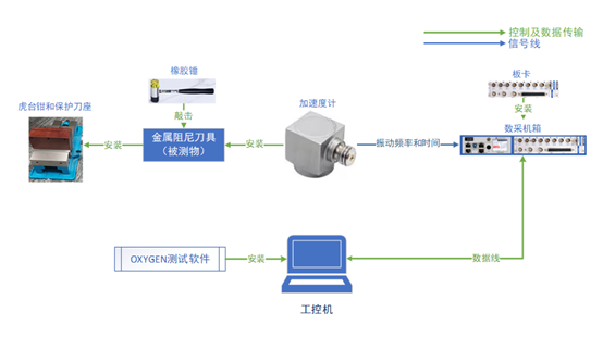 刀具在受到外力激勵時,會產(chǎn)生振動。振動信號中包含了刀具材料、結構設計和制造工藝等方面的信息。阻尼性能是衡量刀具質(zhì)量的重要指標之一,良好的阻尼效果意味著刀具在受到外力作用時,能夠更快地吸收并衰減振動能量,從而保持加工過程的穩(wěn)定性和精度。我們則可以利用這一特點,根據(jù)不同阻尼效果的刀具振動時長不同,來實現(xiàn)快速準確辨別刀具質(zhì)量的好壞。測試框圖如下圖所示: