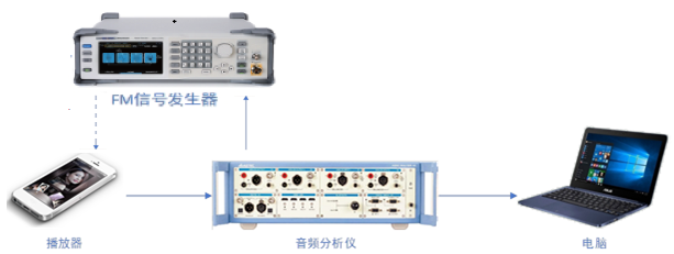 針對FM的收音設(shè)備,在信號(hào)輸入端會(huì)有所改變:使用音頻分析儀的基帶音頻信號(hào)輸出給信號(hào)發(fā)生器,經(jīng)由信號(hào)發(fā)生器調(diào)制為FM信號(hào)后發(fā)送給播放器繼續(xù)測試。