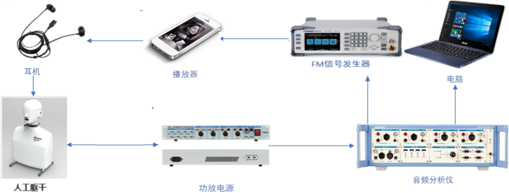 說明:測試系統(tǒng)主要包括:音頻分析儀、功放電源、人工軀干、控制電腦和被測耳機(jī)及播放器,信號(hào)發(fā)生器。